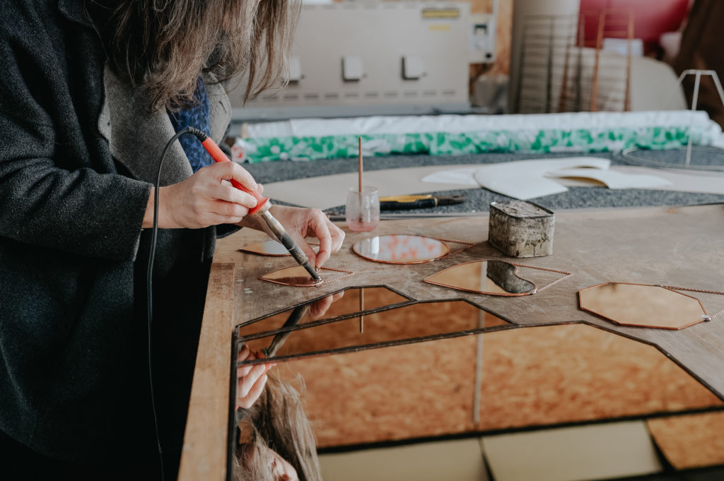 Aujourd’hui artisane d’art, Aurélia s’est d’abord formée en histoire de l’art puis s’est spécialisée dans la restauration des vitraux. Elle travaille quelques années dans une entreprise de Remouillé spécialisée dans ce type d’artisanat. Après la fermeture de l’entreprise, elle quitte les lumières du patrimoine pour celles de l’entrepreneuriat : en 2016, elle dépose sa marque Jeanine, du nom de sa grand-mère, pour laisser rayonner sa créativité et répondre aux besoins particuliers de sa clientèle. Des vitres des églises aux lampes de nos intérieurs, il n’y a qu’un fil… conducteur toujours de couleurs, de reflet et de transparence.