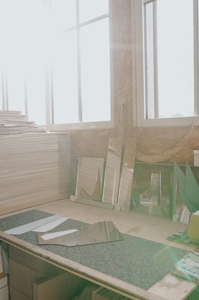 Hasard divin, ou pas, c’est dans un atelier baigné des rayons du soleil que la créatrice cugandaise nous a reçues. Cet atelier, Aurélia l’a voulu, conçu et imaginé et il va sans dire qu’elle l’a souhaité lumineux : il ne pouvait pas en être autrement pour celle qui crée des luminaires (surtout) et des miroirs (aussi). Installée récemment dans ces (superbes) nouveaux locaux, qu’elle partage avec d’autres créatrices Maillo Design et Bosco fleurs, Aurélia fabrique une ligne de luminaires fonctionnels. Constitués d’un abat-jour en tissu, fabriqué à la main, d’une structure d’acier cuivré thermolaqué, dessinée et étudiée d’après prototype, chaque abat-jour, lampe sur pied ou applique est personnalisable. Quant aux miroirs, ils sont dessinés et conçus suivant la technique du vitrail américain « Tiffany » datant du début du XXe siècle. Le verre est coupé à la main, serti de cuivre, soudé à l’étain et patiné à l’atelier.
