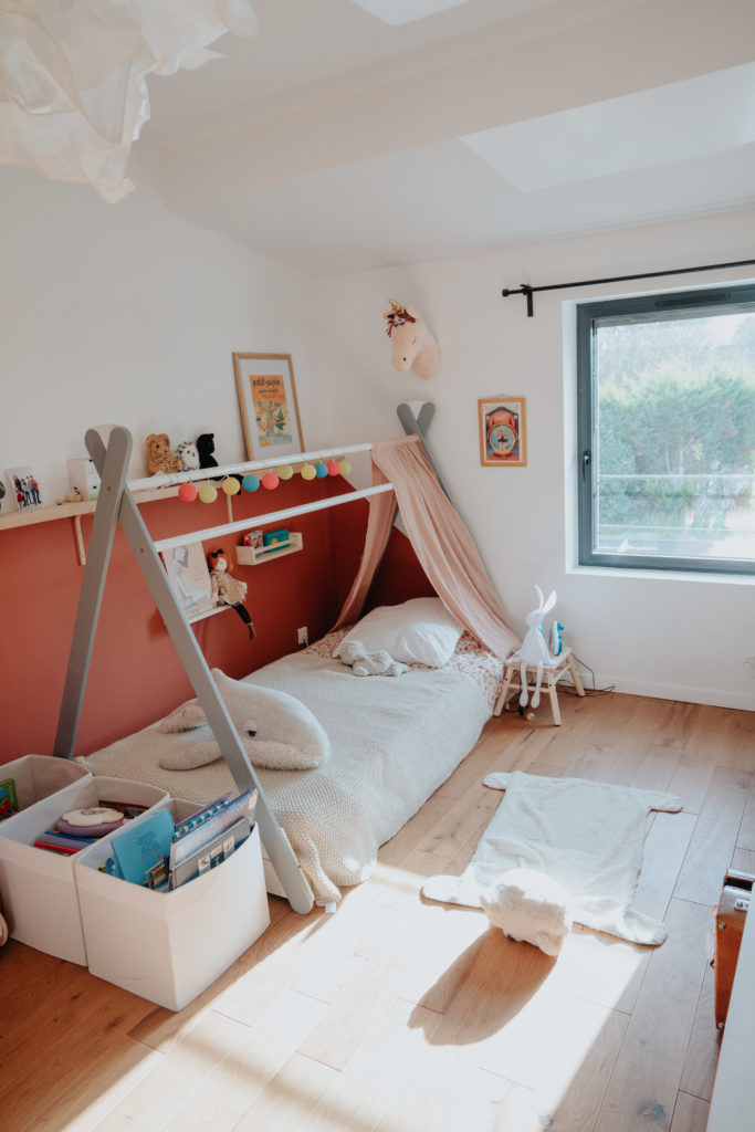 En plus de l’immense pièce de vie, la maison compte quatre chambres et deux salles d’eau, dont l’une pourvue d’un sauna. La chambre parentale a été installée dans l’ancienne cuisine et est jouxtée par un grand dressing de 9 m2 : « l’idée est que d’autres que nous, si nous revendons, puissent en faire autre chose, une vraie pièce s’ils le veulent » explique Tiphaine. « L’emménagement à la lanterne » a lieu au mois de mars 2020 alors que le carrelage n’est pas fini et qu’il n’y a pas encore de cuisine.